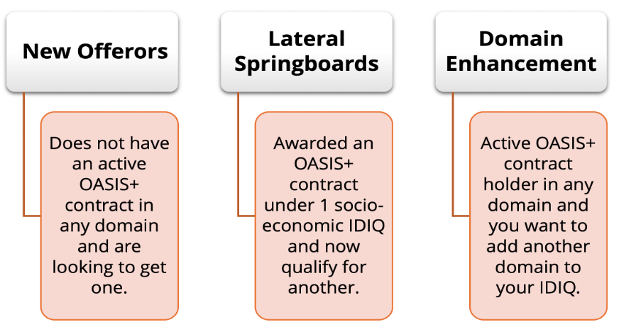 - “New” Offerors: This describes you if you do notcurrently have an active OASIS+ contract and are looking to get one (in any domain). This group may include companies that submitted unsuccessful bids in the first round of proposal submissions.