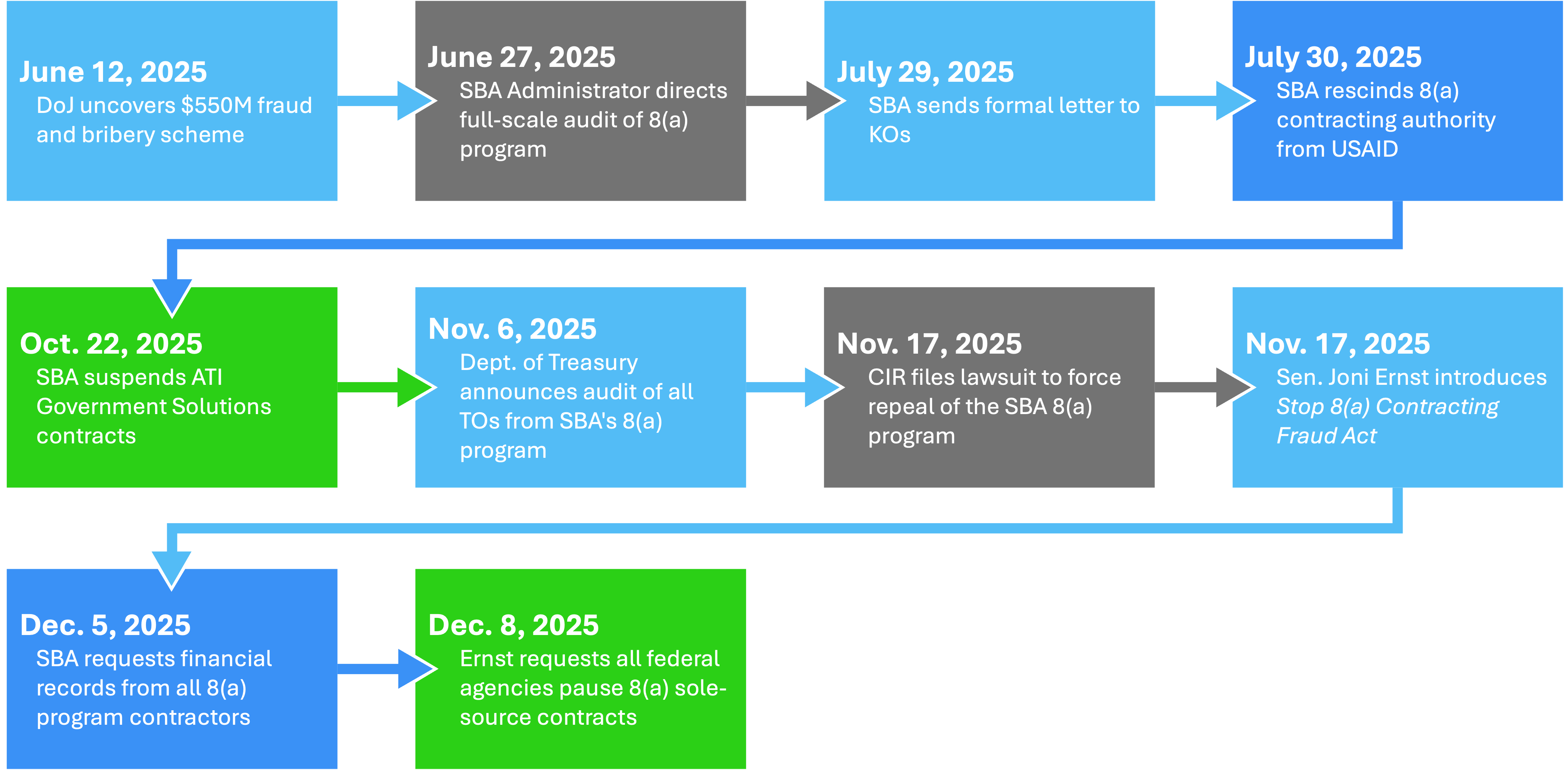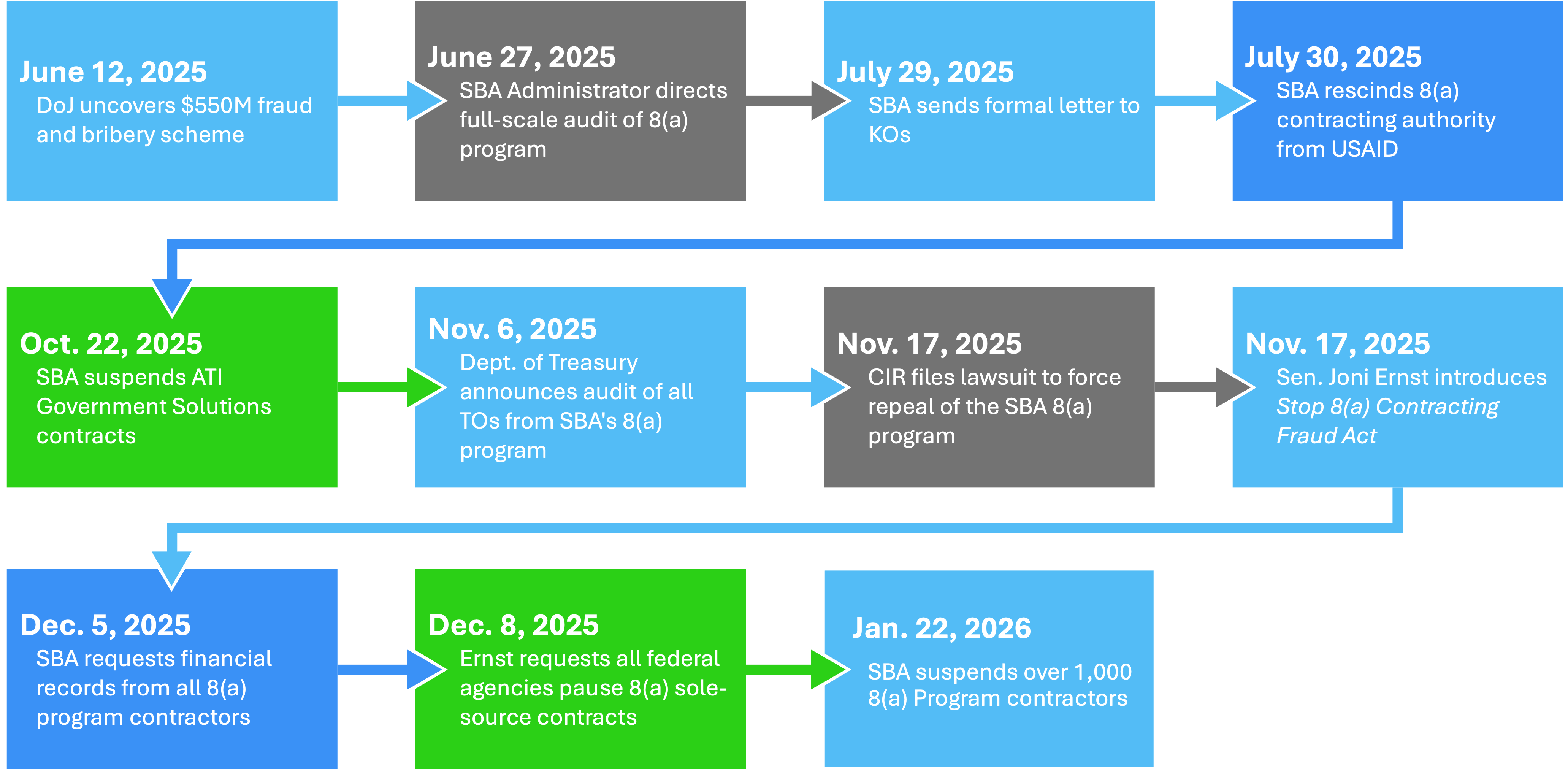 - Nov. 17, 2025: Senator Joni Ernst, Chair of the Senate Committee on Small Business and Entrepreneurship, announced that she is introducing a bill, the Stop 8(a) Contracting Fraud Act, to prohibit the SBA from awarding sole-source contracts until it conducts a full audit of and submits a report on the business development program to Congress.