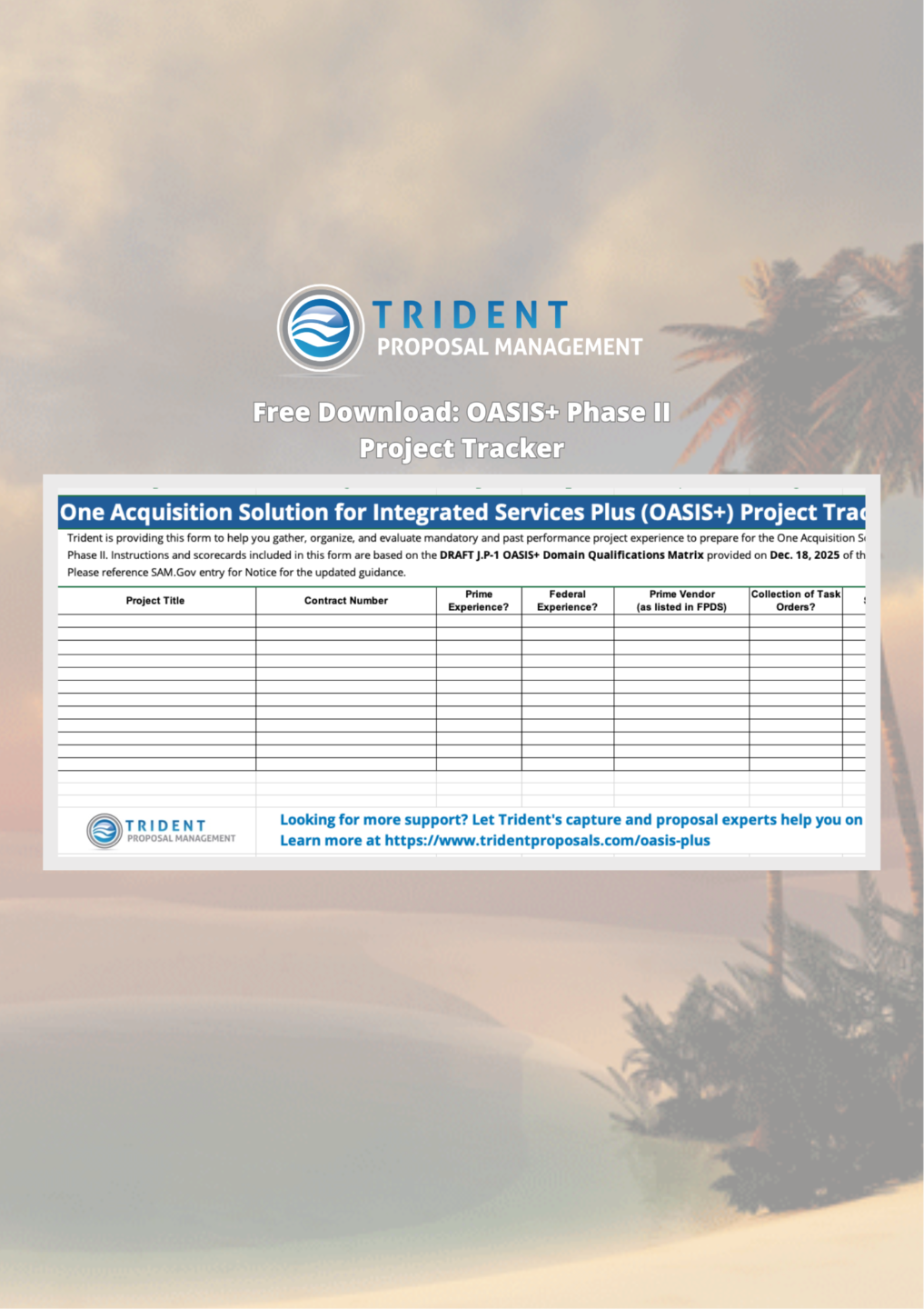 If you are interested in OASIS+ Phase II, we have the right team for you. Our GWAC SMEs have helped capture billions of dollars in contract ceiling via IDIQ, OTAs, and GWACS. Use the form below to contract Trident and get our free basic eligibility checklist emailed directly to you!